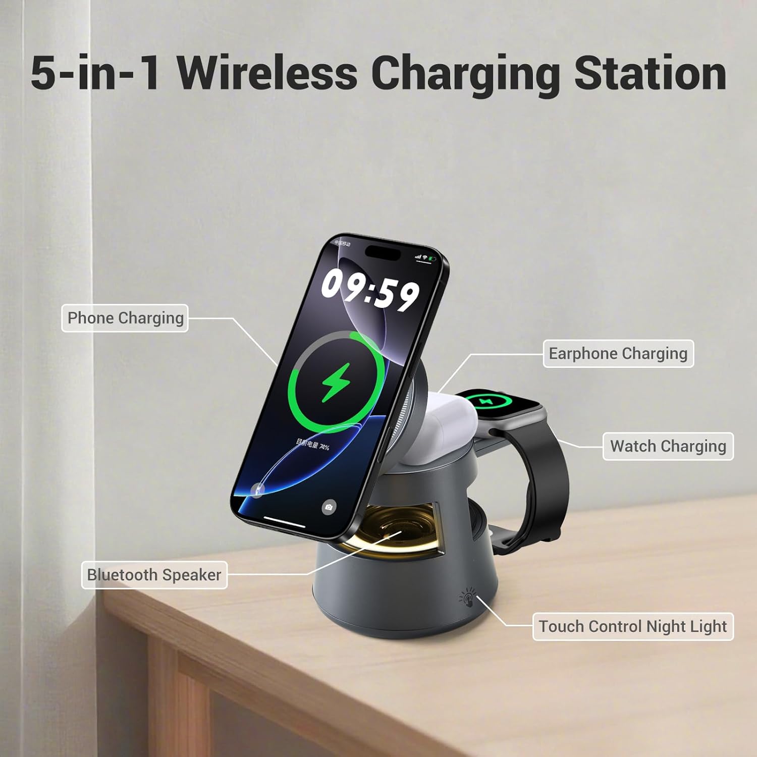 【5-in-1 Wireless Charging Station】 Compatible with iPhones, Apple Watch and AirPods, with bluetooth speaker and warm light lamp, all combined into one device. Say goodbye to tangled cables and multiple chargers with this ultimate charging station.