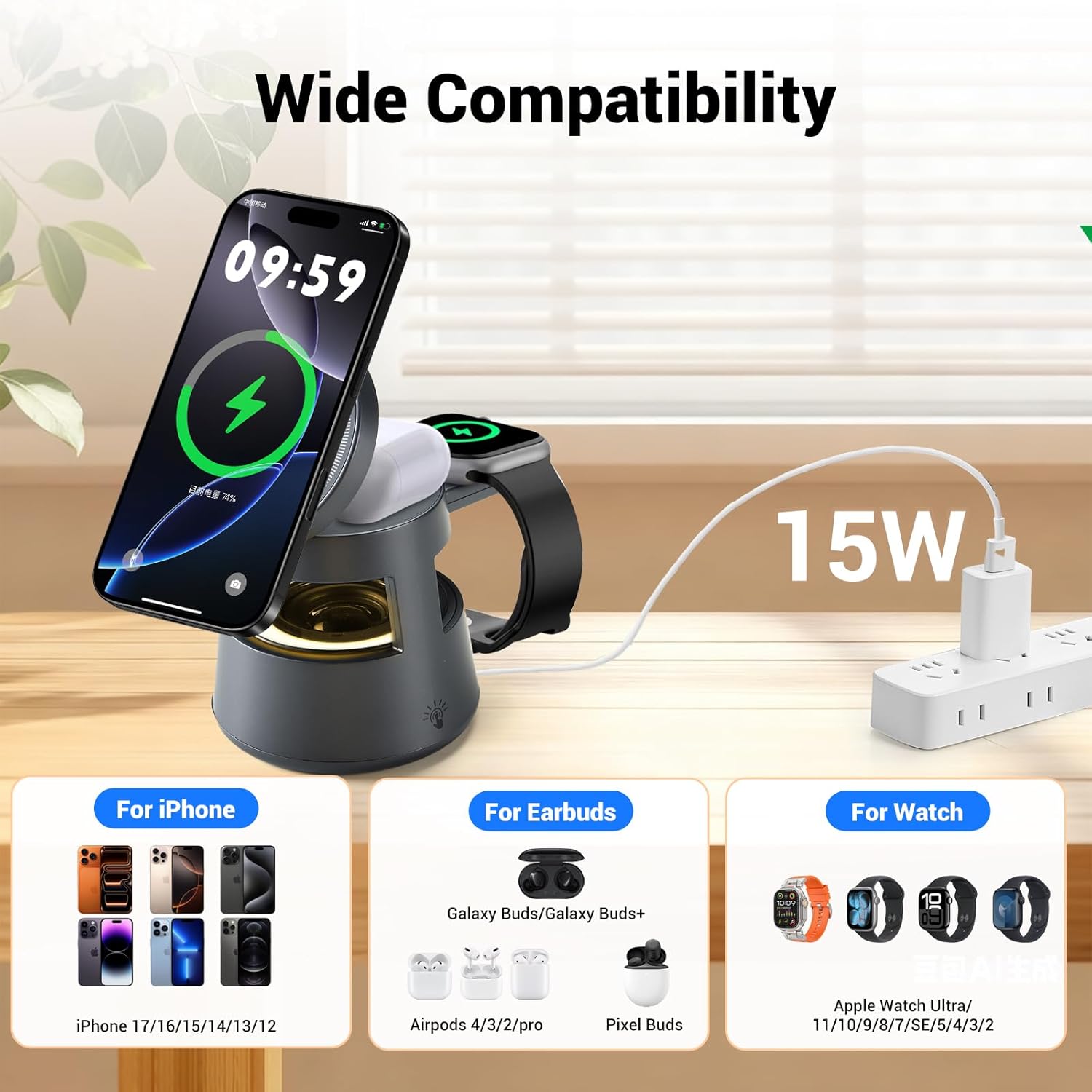 【Wide Compatibility】 This charging station compatible with iPhone 17/16/15/14/13/12, AirPods 4/3/2/Pro, Pixel Buds, Galaxy Buds/Halaxy Buds+, and Apple Watch 11/10/9/8/7/SE/5/4/3/2/Ultra.
